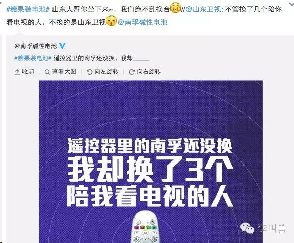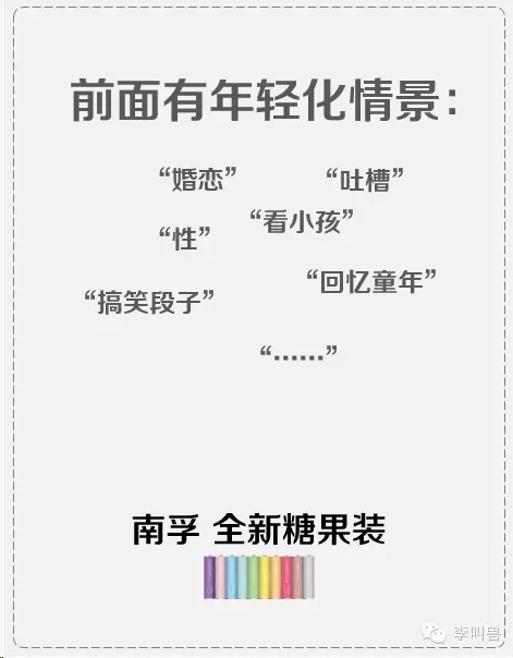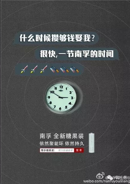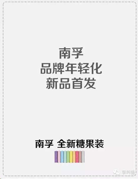 但是南孚如果也这样的话,而且是在互联网上发出来,可能不会有效果。 “颜值提升,内心依然——南孚,全新糖果装” 这样写的话,难免“自嗨”。