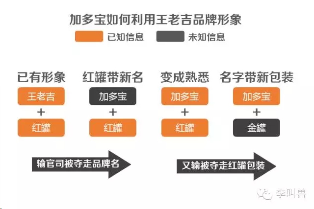 为什么? 因为人难以同时接受2个陌生信息,一般只能依靠一个“已知信息”去带一个“陌生信息”。 比如加多宝被夺走“王老吉商标”后的品牌策略,就是这样: