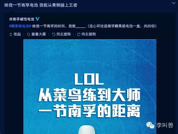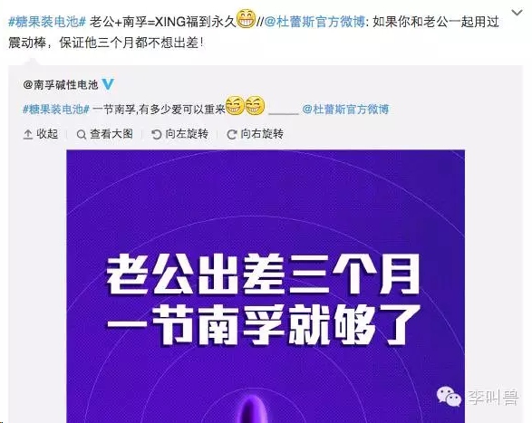 然后把这些情景附着在了年轻人生活上经常发生,并且值得吐槽的事情上,提高情绪价值。 比如“什么时候攒够钱娶我-一节南孚的时间”,附着在了年轻人常见的“逼婚情景”中。 接着利用这些话题,问粉丝“一节南孚的时间,你可以做什么”,可以出发粉丝的二次创作。