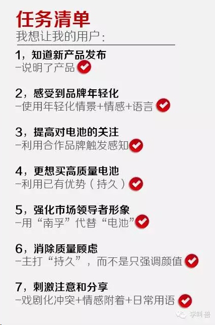 那么如何做呢?如何唤起消费者的关注,并且充分发挥南孚的优势? “写文案前,先列个清单”,所以我先经过分析,列出了我们要通过文案,想要让消费者做的事情:
